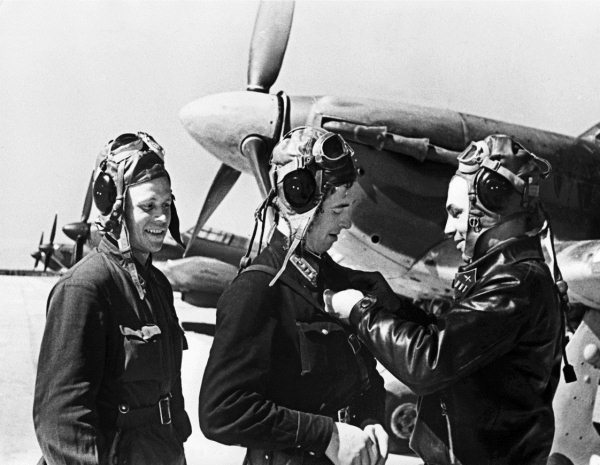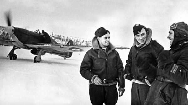 Командир 78-го ИАП ВВС Северного флота майор Борис Сафонов и британские летчики 151-го авиакрыла RAF (Королевские военно-воздушные силы), воевавшие в небе советского Заполярья. На заднем плане истребитель «Харрикейн», аэродром Ваенга, осень 1941 г.