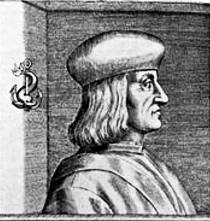 Альд Мануций (слева типографский знак А. Мануция). С современной гравюры.
