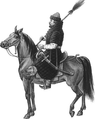 Описание, как видим, отличается довольно существенно от тех пестрых, как радуга, нарядов, которые в стиле тогдашних представлений о «сатанинском воинстве» изобразил Авилов. Выясняется, кроме того, что собачьи головы и метлы у седел – не более чем выдумка. В знак своей принадлежности к опричнине «порученцы» Грозного носили на поясе шерстяную кисть – это и был символ метлы, выметающей измену. Вообще «опричный корпус», как давным-давно отметили историки, имел много общего с духовно-рыцарскими орденами Европы – отобрав из опричников триста человек, царь назвал их «братией», а себя «игуменом», и в Александровской слободе они, в черных рясах, устраивали богослужения.