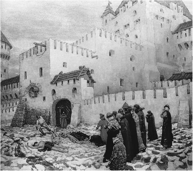 Картина, кстати, истине ничуть не соответствует. Внешний вид опричников? Дьяк Иван Тимофеев, автор знаменитого «Временника», очевидец событий, изображает их совершенно иначе: «Всех их он (Грозный. – А. Б.) от головы до ног облек в темное одеяние и повелел каждому иметь у себя таких же, как и одежды, коней».