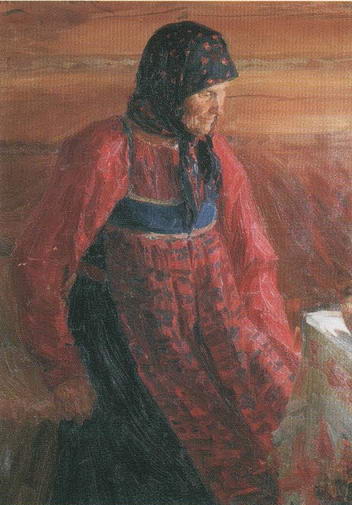На портрете - испещренное морщинами лицо, опущенные на колени трудовые руки, сгорбленная фигура. Все это подчеркивает собирательный образ русской матери- крестьянки, которая, несмотря на изменившиеся материальные условия жизни, по своим привычкам оставалась типичной крестьянкой, рачительной хозяйкой и вечной труженицей.