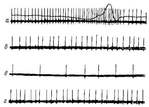 Рис. 18. Влияние раздражения коры большого мозга и мозжечка на электрическую активность клеток ретикулярной формации а — контрольная запись исходной электрической активности клетки ретикулярной формации; б — изменение этой активности под влиянием раздражения мозжечка; в — контрольная запись исходной электрической активности клетки ретикулярной формации, г — изменение этой активности при раздражении коры большого мозга