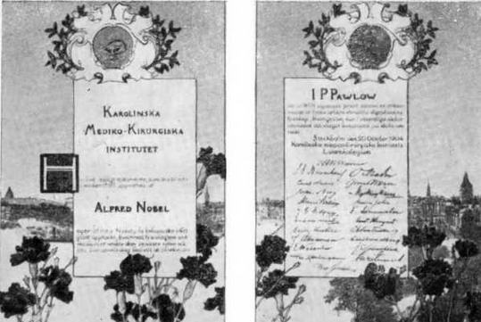 в которой говорилось: «На кафедру физиологии в Томске назначен доктор зоологии Великий [...] Мы не можем не выразить искреннего сожаления, что первоначально имевшееся в виду назначение на эту кафедру частного преподавателя физиологии в академии Павлова почему-то не состоялось [...] Павлов, давно уже и по справедливости считающийся одним из лучших физиологов России, представлял в данном случае особенно выгодные условия; он не только доктор медицины, но и кандидат естественных наук, и, кроме того, в течение многих лет постоянно работал и помогал другим работать в клинике С. П. Боткина. Нам известно, что неназначение Павлова удивило, между прочим, и такого сведущего судью в этом деле, как И. М. Сеченов» [24 «Врач», 1889, № 1.].Диплом лауреата Нобелевской премии, присужденный Павлову в 1904 г.