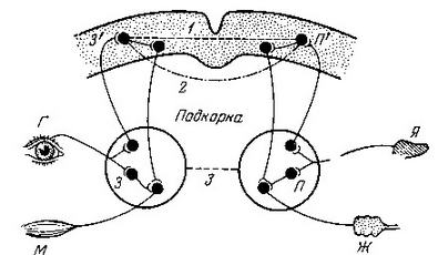 ГЗМ — дуга зрительного подкоркового безусловного рефлекса; ГЗ'М — дуга зрительного коркового безусловного рефлекса; ЯПЖ — дуга слюноотделительного подкоркового безусловного рефлекса; ЯП'Ж — дуга слюноотделительного коркового безусловного рефлекса. 1 — условная связь по толще коры, 2 — через подкорковое белое вещество, 3 — через подкорковые центры