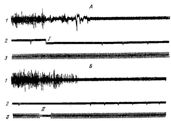 а — пассивный подъем лапы наряду с исчезновением потенциалов в электромиограмме (I) вызывает условное слюноотделение (прямая связь), б •— еда (II) вызывает безусловно-рефлекторное слюноотделение и наряду с этим условно-рефлекторное выпадение потенциалов в ЭМГ (обратная условная связь). 1 — ЭМГ, 2 — слюна в каплях, 3 — время (большая амплитуда) и еда (малая амплитуда)