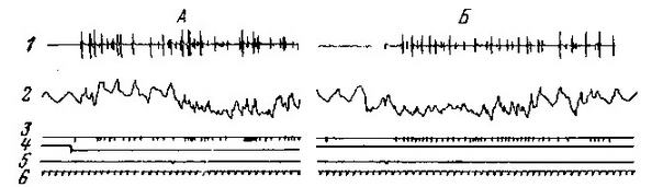 А — воздушный толчок в глаз вызывает собственный безусловный рефлекс (мигание) и наряду с этим условно-рефлекторное слюноотделение (прямая условная связь); Б — еда вызывает слюноотделение и условно-рефлекторно — мигание (обратная условная связь). 1 — мигание, 2 — дыхание, 3 — слюноотделение, 4 — условный раздражитель, 5 — безусловный раздражитель, 6 — время в секундах