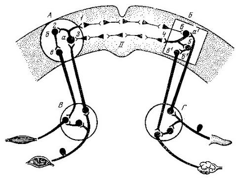 А — кортикальный пункт мигательного рефлекса: а — афферентный нейрон, б — вставочный нейрон, в — эфферентный нейрон; 1 и 2 — синаптические контакты коллатералей афферентного нейрона на вставочные нейроны; 3 — синаптический контакт между вставочным нейроном обратной условной связи и афферентным нейроном сигнального раздражителя. Б — кортикальный пункт пищевого рефлекса: а1 — афферентный нейрон; б1 — вставочный нейрон; в1 — эфферентный нейрон; 4 и 5 — синаптические контакты коллатералей афферентного нейрона на вставочный нейрон; 6 — синаптический контакт между вставочным нейроном прямой условной связи и афферентным нейроном подкрепляющего раздражителя. I — прямая условная связь; II — обратная условная связь, В — субкортикальный пункт мигательного рефлекса, Г — субкортикальный пункт пищевого рефлекса