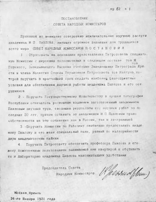 Постановление Совета Народных Комиссаров о И. П. Павлове, подписанное В. И. Лениным