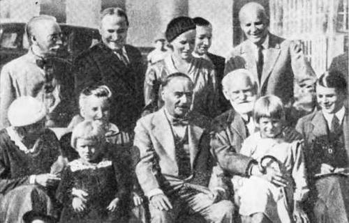 отношении самого Павлова, так и Советской власти. По мере того как культура отбрасывает сверхъестественное, она начинает все более и более считать человека наивысшим предметом человеческого познания, а природу его умственной деятельности и ее плоды — предметами наивысшей фазы науки о человеке. К подобным исследованиям в Советском Союзе относятся с величайшим вниманием. Поразительные коллекции скифского и иранского искусства в Эрмитаже в Ленинграде никогда так не лелеялись бы, если бы они не являлись памятниками развития человеческой мысли. Благодаря случайностям судьбы получилось, что жизнь того человека, который сделал больше кого-либо другого для экспериментального анализа умственной деятельности, совпала по времени и по месту с культурой, которая возвысила человеческий разум»[25 «Nature», 1936, № 2464, р. 483-485.]. Американский ученый У. Кэннон вспоминал: «В последний раз я видел Павлова в Ленинграде и Москве на заседаниях конгресса в 1935 г. Ему тогда было 86 лет, и он еще сохранил много прежней подвижности и жизненной энергии. Незабываемым остается день, проведенный с ним в окрестностях Ленинграда, в громадных новых зданиях института, построенных советским правительством для продолжения экспериментальных работ Павлова. Во время нашей беседы Павлов вздохнул и выразил сожаление, что такие грандиозные возможности не были предоставлены ему 20 лет тому назад. Если бы можно было повернуть время назад, то ему, Павлову, было бы 66 лет, а это возраст, когда обычно деятели науки уже отходят от активной работы!» [26 W. В. Connon. The way of an investigator. N. Y., 1945, p. 187.]И. П. Павлов с Г. Уэллсом, его сыном и членами своей семьи