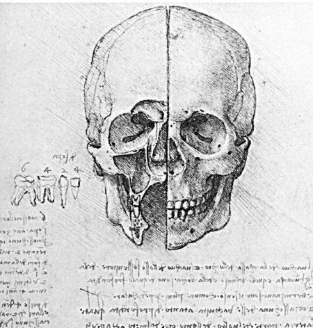 исследованных великим Леонардо, упомянем о его детальной прорисовке человеческого черепа и детальном описании зубов (1489 г.). Именно Леонардо впервые четко обозначил столь привычное нам разделение зубов на коренные и некоренные.Рисунок Леонардо да Винчи
