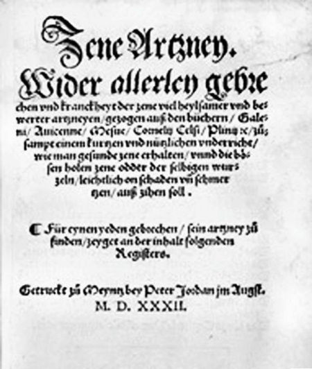 Частью этого процесса стала опубликованная в 1530 г. в Лейпциге первая книга, посвященная исключительно терапевтической стоматологии, – «Малая медицинская книга о всех видах заболеваний и немощей зубов». Хотя ее текст был основан на сочинениях Цельса, Галена, Авиценны и других классических и арабских медицинских авторов, эта книга носила уже узкоспециализированный характер.