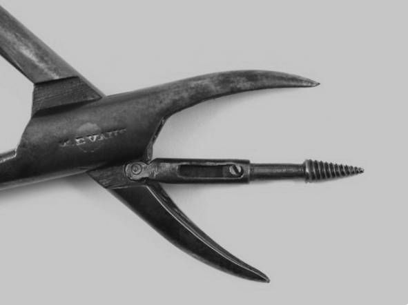 Стоматологические щипцы с винтом. 1850 г. Винт вкручивался в зуб, а затем, после захвата щипцами, он извлекался