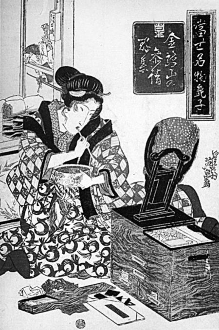 Японская дама, чистящая зубы кончиком расщепленного ивового прутика. Перед нею коробочка с зубным порошком. Раскрашенный рисунок. Около 1830 г.