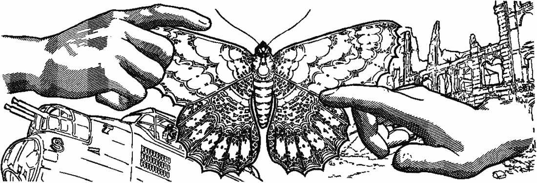 Семеро мальчиков и, по странной случайности — мотылек. Он, конечно, залетел в самолет, когда команда занимала места. С тех пор он порхает здесь и там, облетает свою тюрьму сверху донизу, от одного прозрачного колпака турели к другому. Его влечет странная тоска, неосознанная потребность в паре. В поисках второго он мягко наталкивается то на одну, то на другую мягкую человеческую щеку, целует их прикосновением ресниц невидимой любимой, тратит впустую мгновения жизни, которых у него наперечет. Или бессильно бьется в тюремное окно, привлеченный светящимися точками на небе, но не сознавая величия галактик.