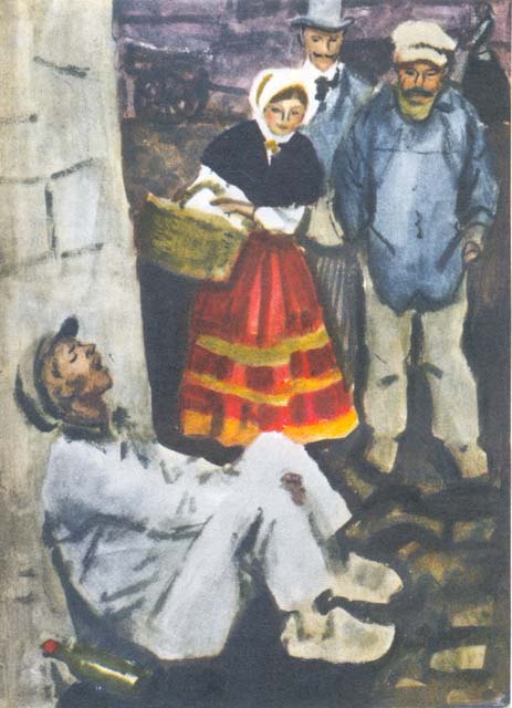 Но вот однажды доктор Барбезоль, выйдя рано утром, на пороге одного из домов увидал человека в серой холщовой одежде — человек спал, прислонившись головой к стене. Он подошел, узнал Изидора, попытался его разбудить, но это ему не удалось. Бывший избранник спал глубоким, непробудным, тяжелым сном, и пораженный доктор пошел за помощью, чтобы перенести молодого человека в аптеку Боншеваля. Когда Изидора подняли, из-под него выкатилась пустая бутылка; понюхав ее, доктор объявил, что она из-под водки. Это послужило указанием, как привести Изидора в чувство. Наконец это удалось. Он был пьян и совершенно одурел, пропьянствовав всю неделю. Он был пьян и настолько омерзителен, что ни один тряпичник не дотронулся бы до него. Его прекрасный белый полотняный костюм превратился в изжелта-серые, засаленные, грязные, гнусные лохмотья, и от него несло всеми запахами сточной канавы, помойки и порока.