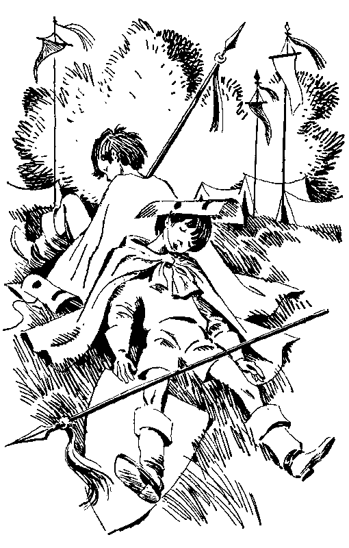 Из центральной палатки вылез заспанный горнист Алешка Званцев в картонной мушкетерской шляпе и красной ситцевой мантии. На изнанке мантии были заметны следы меловых букв: «ДОБ… ПОЖ…» Алешка сердито глянул на малька-оруженосца, расставил босые ноги и хрипло затрубил.