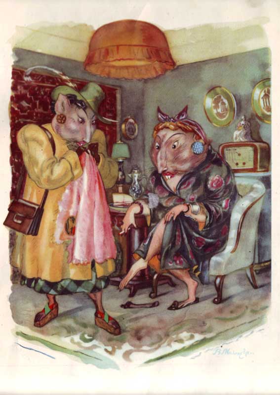 лоскуток персидского ковра! А этот нежный пух достали мне вчера - Он африканский. Он от Пеликана!» - «А что ты ешь? – спросила Крысу Мышь - Есть то, что мы едим, тебе ведь не пристало!» «Ах, душенька! – ей Крыса отвечала. – Тут на меня ничем не угодишь!Вот разве только хлеб я ем и сало!..»
