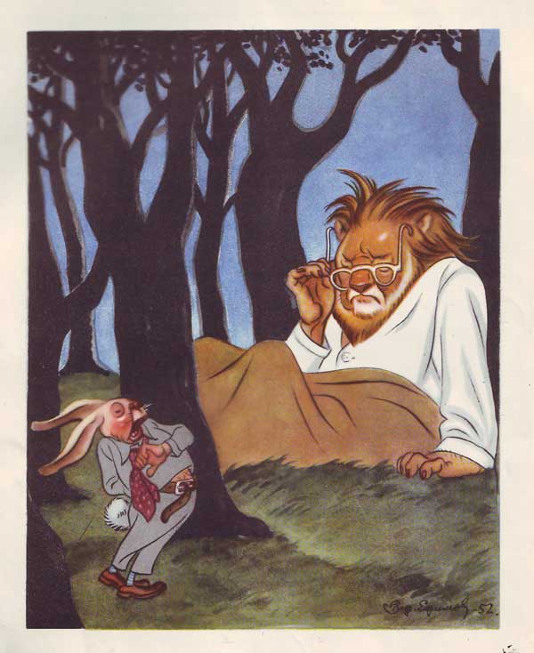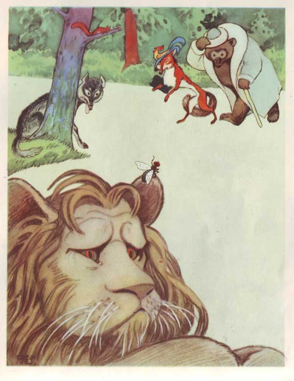 Раз Мухе довелось позавтракать со ЛьвомОт одного куска и за одним столом.Вот Муха досыта наелась,Напилась,Собралась улетать, да, видно, расхотелось(На Львином ухе солнышком пригрелась),Осталась на обед, а там и… прижилась.В недолгом времени пошла молва,Распространяться стали слухи(Их разносили те же Мухи!),Что Муха-де живёт советницей у Льва,Что в нейГроза зверейДуши не чает.Случись по делу отлучиться ей,Так он уж загодя скучает —Не ест, не пьёт,И сам завёл такой обычай:Когда уходит на добычу,То Муху он с собой берёт,А раз она сидит на Львином ухе,То может нажужжать, что в голову взбредёт!..Ну, как тут не бояться Мухи?..А Льву и невдомёк, что Муха так сильна,Что перед ней все лезут вон из кожиИ что онаВ его прихожейДелами Львиными подчас вершит одна!