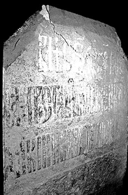 Рис. 24. Надгробная плита-новодел XVII века в Архангельском соборе Московского Кремля. Приставлена к гробнице якобы Ивана Калиты. Хорошо видно, что даже этот романовский новодел был сильно отредактирован. Часть надписи уничтожена, часть явно переделана, причем, очень грубо. Фотография 1997 года