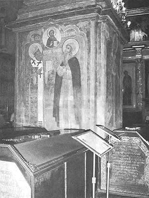 Оказывается, ВСЕ ТЕ ГРОБНИЦЫ, КОТОРЫЕ СТОЯТ В СОБОРЕ СЕГОДНЯ — ЭТО КИРПИЧНЫЕ НАДГРОБИЯ, ИЗГОТОВЛЕННЫЕ В XVII ВЕКЕ ПРИ РОМАНОВЫХ [22], с. 24. Их делали примерно в то же время, когда сбивали старые фрески со стен и сводов собора и вместо них писали новые. Считается, что «погребение совершали в белокаменных саркофагах, которые опускали В ЗЕМЛЮ ПОД ПОЛ. В ПЕРВОЙ ПОЛОВИНЕ XVII ВЕКА НАД ЗАХОРОНЕНИЯМИ УСТАНОВИЛИ КИРПИЧНЫЕ НАДГРОБЬЯ с белокаменными плитами, украшенными… славянскими надписями. В начале XX века надгробья были заключены в медные застекленные футляры» [22], с. 25–26. См. рис. 30.