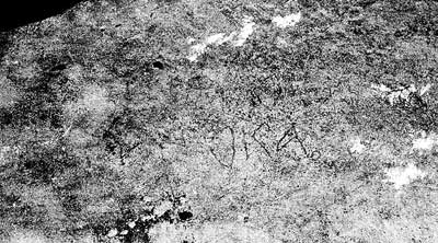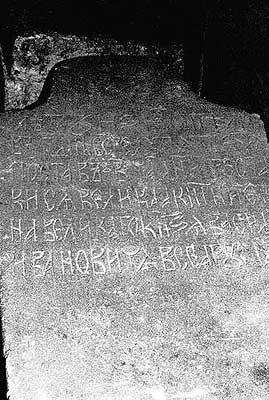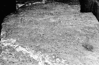 Рис. 35. Гробница якобы Софьи Витовтовны, жены Василия II Темного. Якобы XV век. Крышка гробницы с грубо процарапанной надписью «Со инока», то есть «Софе инока», или «София инокиня». Фотография 1997 года