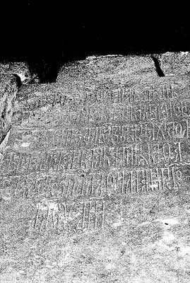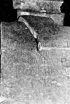 2) Тот же вопрос возникает и в связи с гробницей номер 5. См. план на рис. 33, рис. 35, рис. 42. Якобы это гробница Софьи Витовтовны, жены Василия II, XV век. И опять тут нет никаких надписей, кроме небрежно, наискось и неглубоко процарапанных слов «Софе[я] инока» на крышке. То есть — СОФЬЯ ИНОКИНЯ, рис. 35. На рис. 44 мы даем прорисовку этой с трудом различимой надписи. Для прорисовки мы пользовались качественной цветной фотографией, сделанной нами. На ней надпись вполне различима, однако на черно-белом снимке не видно уже ничего. Неужели этот простой и дешевый гроб с корявой надписью — тоже ЦАРСКАЯ гробница? Можно ли поверить, что русские царицы Софья Палеолог