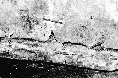 Рис. 43. Саркофаг якобы «Софьи Палеолог», жены Ивана III. Кусок крышки у изголовья. Вдоль границы слома грубо и неглубоко процарапана надпись «Софъа». И ЭТО — ЕДИНСТВЕННАЯ НАДПИСЬ НА САРКОФАГЕ! Мы ее хорошо разглядели с фонариком, но она настолько слабо процарапана, что на фотографии, сделанной со вспышкой, практически неразличима. Этот якобы царский саркофаг незамысловато изготовлен из обломков каменных плит разной толщины, соединенных медными скобами и оштукатуренных. Фотография 1997 года