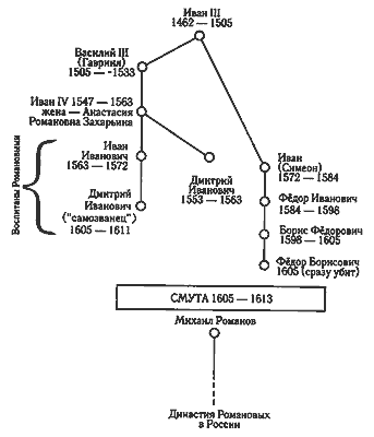 Таким образом, согласно нашей реконструкции, в конце XVI века династический поток московских царей раздваивается, рис. 2. В лице молодого царевича Дмитрия Ивановича, насильно постриженного в монахи, возникает отстраненная от власти, «обиженная» династическая ветвь. Тесно связанная с боярами Романовыми-Захарьиными, которые были близкими родственниками и опекунами отца постриженного царевича, царя Ивана Ивановича, рис. 1.