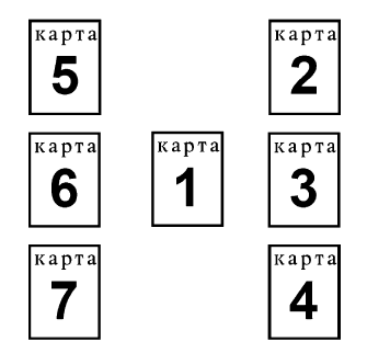 Расклад «Колонны»Это один из самых простых раскладов, позволяющих узнать, как к вам относится интересующий вас человек. Для его выполнения из колоды нужно выбрать одну карту и положить ее в центр – она расскажет, что связывает вас и интересующего вас человека, и есть ли такая связь вообще. Седьмая карта открывается последней и связывает весь расклад в единую систему (рис. 31).