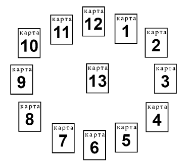 Расклад «Часы судьбы»Этот расклад рекомендуется использовать в новогоднюю ночь или в день рождения. Он рассказывает о предстоящих событиях и выполняется следующим образом. Перетасовав карты, выберите одну и положите ее в центр – это будет определяющая карта предстоящего года. Затем выберите еще 12 карт и разложите их подобно циферблату часов (рис. 33).