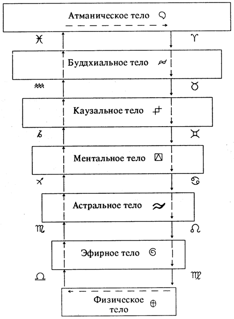 Объединяя все зодиакальные потоки в один, мы получаем первое представление о глобальном информационно-энергетическом потоке организма, разрывы в котором приходятся на тонкие тела: по одному разрыву на крайние тела (атманическое и физическое) и по два разрыва на каждое промежуточное тело (буддхиальное, каузальное, ментальное, астральное, эфирное). Для окончательного замыкания в кольцо глобального потока нам нужно, очевидно (см. рис. 1), ввести транзитные потоки крайних тел и восходящие и нисходящие транзитные потоки промежуточных тел (они на рисунке обозначены пунктирными стрелочками), и тогда 24 потока, изображенные на рис. 1, в совокупности составят глобальный поток организма. Если мыслить организм как единое целое, то вполне можно исходить в качестве основы из представления о глобальном потоке, а тела представлять себе как линзы, различным образом трансформирующие этот поток.