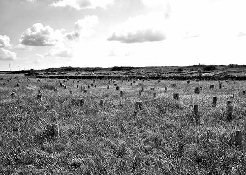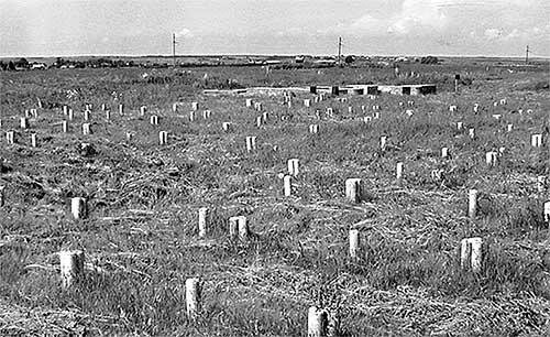 Рис. 92. Следы деревянной части Билярской мечети. Места, где были обнаружены следы колонн и других конструкций, обозначены вбитыми в землю бетонными трубами.