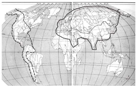 Рис. 95. Границы Великой = «Монгольской» Империи XIV–XVI веков. Сплошная линия – граница эпохи XIV века. Пунктирная линия – новые земли, вошедшие в Империю в XV–XVI веках [6т1]