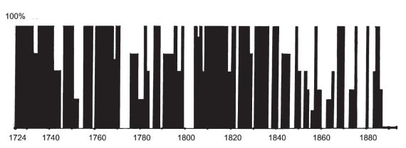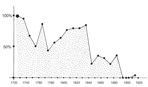 Рис. 103. График, показывающий процент иностранцев-академиков в Российской Академии Наук до 1911 года. Около 120 лет, вплоть до 1841 года, подавляющее большинство академиков – иностранцы [736], кн.1