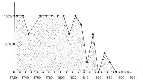 Рис. 105. Усредненный по десятилетиям график, показывающий процент иностранцев среди академиков-историков до 1917 года [736], кн. 1