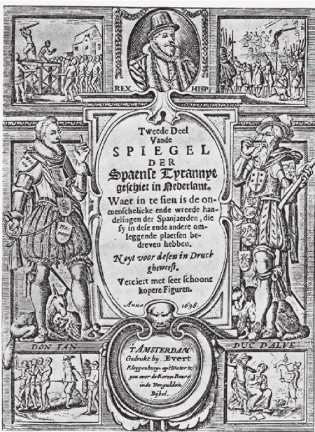 Рис. 106. Пропагандистская книга «Зерцало испанской тираннии». Изображены «тираны, подавлявшие реформацию». Так мятежники приклеивали ярлыки тем, кто стремился остановить бунт [330], т. 3, вклейка между стр. 280–281