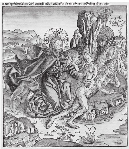 Рис. 18. Ева появляется из разреза на боку Адама. «Всемирная Хроника» X. Шеделя [1396:1], лист VI оборот