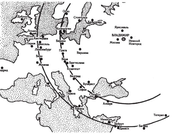 Ответ следующий. Действительно, существует центр, относительно которого наилучшим образом выстраиваются по двум окружностям почти все перечисленные столицы. И эта точка – город ВЛАДИМИР на Руси, рис. 25. Кстати, не этим ли обстоятельством объясняется и его громкое имя: Владимир, то есть Владеющий Миром? Эту работу выполнил