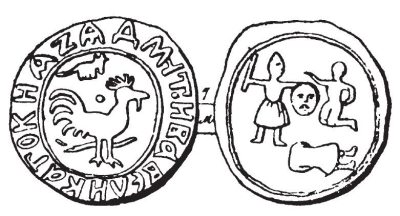 На рис. 40 представлена монета Дмитрия Донского, изображающая его победу над Иваном Вельяминовым. Дмитрий со щитом замахивается мечом, чтобы отрубить голову противнику, стоящему на коленях. Тут же, как это часто делалось на старинных миниатюрах, показано и тело противника, поверженное и уже без головы. На щите Дмитрия изображено человеческое лицо. Но щит с лицом или с головой на нем хорошо известен в «античной» мифологии. Это щит Персея с головой Горгоны Медузы. Итак, щит Персея был известен на Руси и приписывался Дмитрию Донскому. Щит с головой изображался не только на монетах, но и на миниатюрах русских летописей [КР], гл. 3.