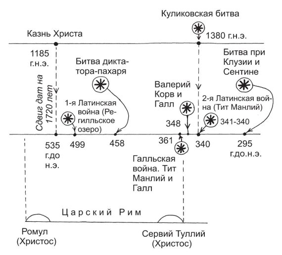 битвы решился в поединке юного военного трибуна Тита Манлия = Дмитрия Донского с великаном Галлом = ханом Мамаем [ЦРИМ], ГЛ. 4. См. рис. 42.Рис. 42. Четыре основных отражения Куликовской битвы 1380 года в «античной» римской истории [ЦРИМ], гл. 4