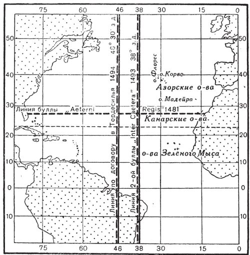 Сообщается: «Так явились на свет знаменитые буллы папы Александра VI… вводившие кастильских королей ВО ВЛАДЕНИЕ КОЛОССАЛЬНЫМИ ВОДНЫМИ ПРОСТРАНСТВАМИ И ЗЕМЛЯМИ… Принято считать, что Александр VI был посредником в кастильско-португальском споре и что он, желая примирить тяжущиеся стороны, "разделил мир" между обеими пиренейскими державами» [707], с. 247–248.