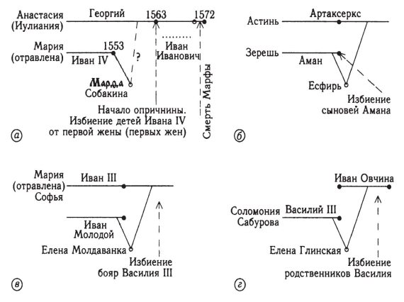 На рис. 64 показана схема истории Есфири в нескольких ее вариантах. Наиболее интересен оригинал в XVI веке. Сильно обобщая, его можно описать так.
