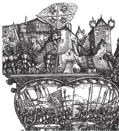 Солнце, двигаясь по небосводу, наталкивается на царскую корону и останавливается. Мы видим, что открытие гелиоцентрической системы изображали на гербах Ордынской Империи. На «Арке Славы» присутствуют также изображения остановленного солнца, зажатого между двумя царскими коронами. Такие же изображения есть и в «Триумфальной Процессии», рис. 66, а также на гравюре А. Дюрера «Большая Триумфальная Колесница» [ПЕ].