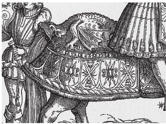 Рис. 66. Символы остановленного солнца на конской попоне. Солнце зажато двумя царскими коронами [1273:2], лист 123