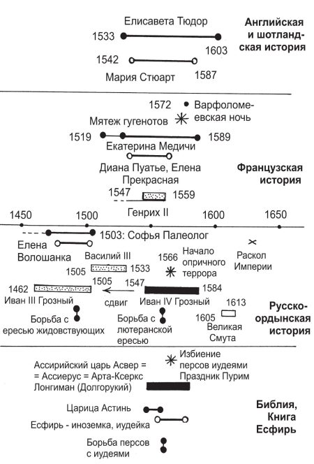 Елена Волошанка, соперница Софьи Палеолог при русско-ордынском дворе, – она же, библейская Есфирь, – отразилась в западных летописях как известная Диана Пуатье, а также как знаменитая Мария Стюарт, ее современница из XVI века. Обратите внимание на сходство имен Есфири и Стюарт. Библейское ЕСФИРЬ или ЕСТИРЬ или СТР, без огласовок (ввиду перехода Ф в Т), было воспринято в Европе как имя СТЮАРТ, то есть СТРТ, без огласовок. Или же АСТЕР, то есть ЗВЕЗДА, по-латински.