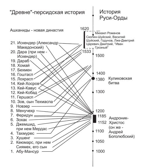 Отступление Ксеркса из Эллады – это отступление войск Грозного из Ливонии. Поражение персов при Платеях – это поражение русских под Полоцком. Гибель персидского полководца Мардония – это гибель знаменитого Малюты Скуратова. Он же – библейский Олоферн. «Античный» перс Тирибаз при Артаксерксе является еще одним отражением князя Курбского на страницах Плутарха.