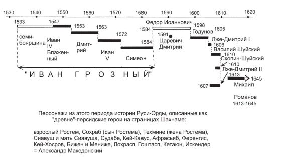 27) В истории «античного» Рима Грозный отразился как «четверка» известных императоров: ТИБЕРИЙ + КАЛИГУЛА + КЛАВДИЙ + НЕРОН [1 т]. В основном, соответствие выглядит так (хотя местами есть путаница), см. пункты 28–31: Иван Блаженный 1547–1553; Дмитрий Иванович 1553–1563; Иван Иванович 1563–1572; Симеон-Иван Бекбулатович 1572–1584. Оказывается, в «античной» литературе они отразились как:
