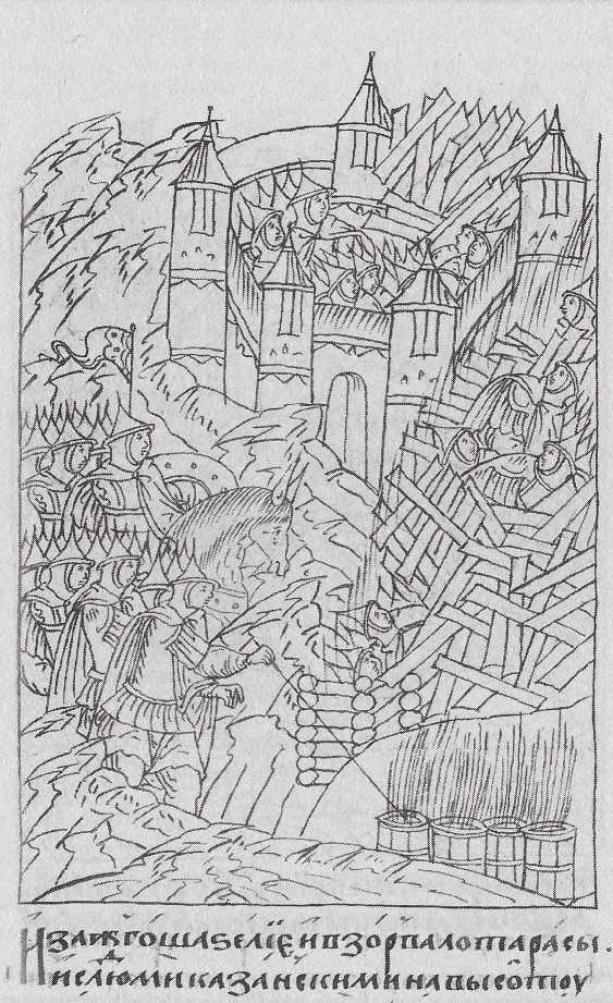 расы с людьми казанскими на высоту великую, и с высоты бревна падали на город, и побило множество татар; горожане же страха и ужаса наполнились». На миниатюре справа внизу показан взрыв бочек с порохом.