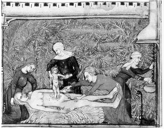 Рис. 9. Старинное изображение кесарева сечения. Франция, якобы XV век. Почему оно называется «кесаревым» и почему оно неоднократно упоминается в «античных» легендах и мифах, мы объясняем в книгах «Царь Славян» и «Начало Ордынской Руси». Взято из [643:2], с. 162, илл.2.
