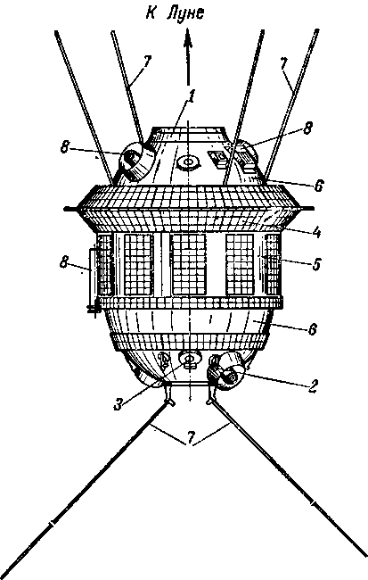 Рис. 2. Схематическое изображение общего вида автоматической межпланетной станции. 1 —иллюминатор для фотографических аппаратов; 2 — двигатель системы ориентации; 3 — солнечный датчик; 4 —секции солнечной батареи; 5 — жалюзи системы терморегулирования; 6 — тепловые экраны: 7 — антенны; 8 —приборы для научных исследований.